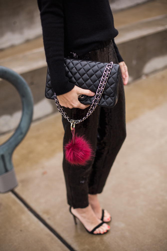Top: Halogen. Pants: Chelsea 28 ( I have them in silver also). Shoes: Express (similar here and here). Bag : Chanel (similar here). Bag Charm: Halogen (similar here).