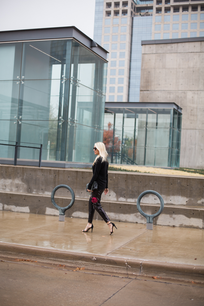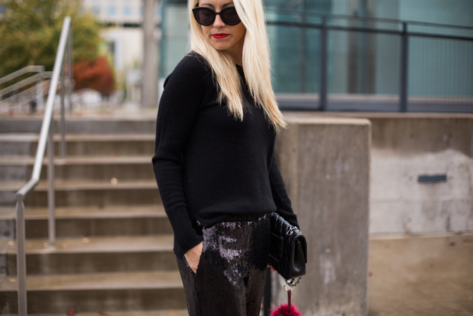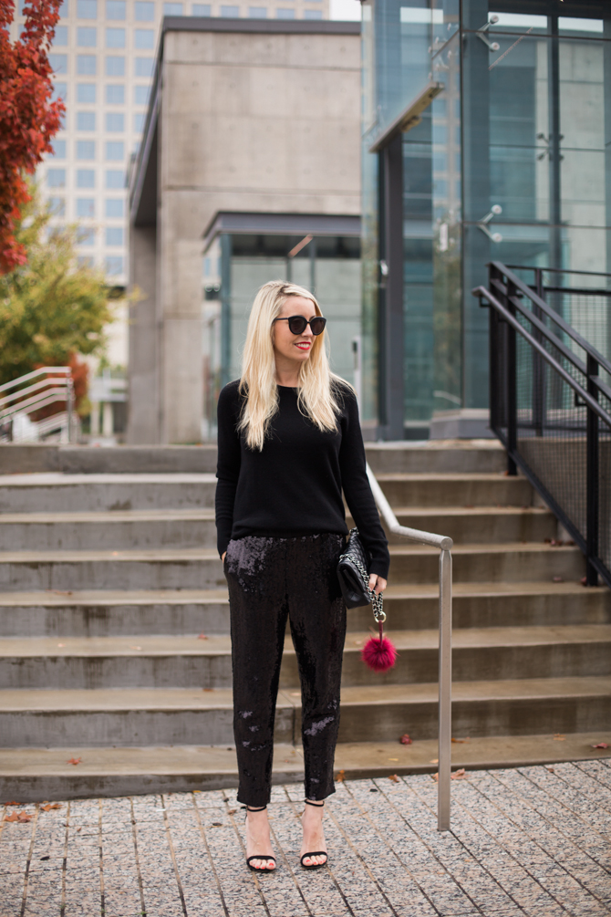 Anyone have any fun holiday parties planned? I don’t know about you, but sometimes I am just not in the mood to wear a dress. Mostly because I probably ate too much that day, or sometimes it is just too cold! Whatever the case may be, it is great to have an alternative… enter the sequins pants. Sequins pants are so fun and different that I have started grabbing them over my dresses and bought the silver pair this year as well. They really are a piece you will wear for years to come.