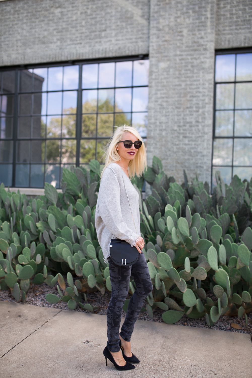 grey fringe trim sweater, grey and black camo jeans, camo skinny jeans, black suede pumps, chain strap crossbody bag