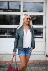 Pintucked Leather Fitted Jacket / Red Henri Bendel Bag / Denim Cut-Off Shorts