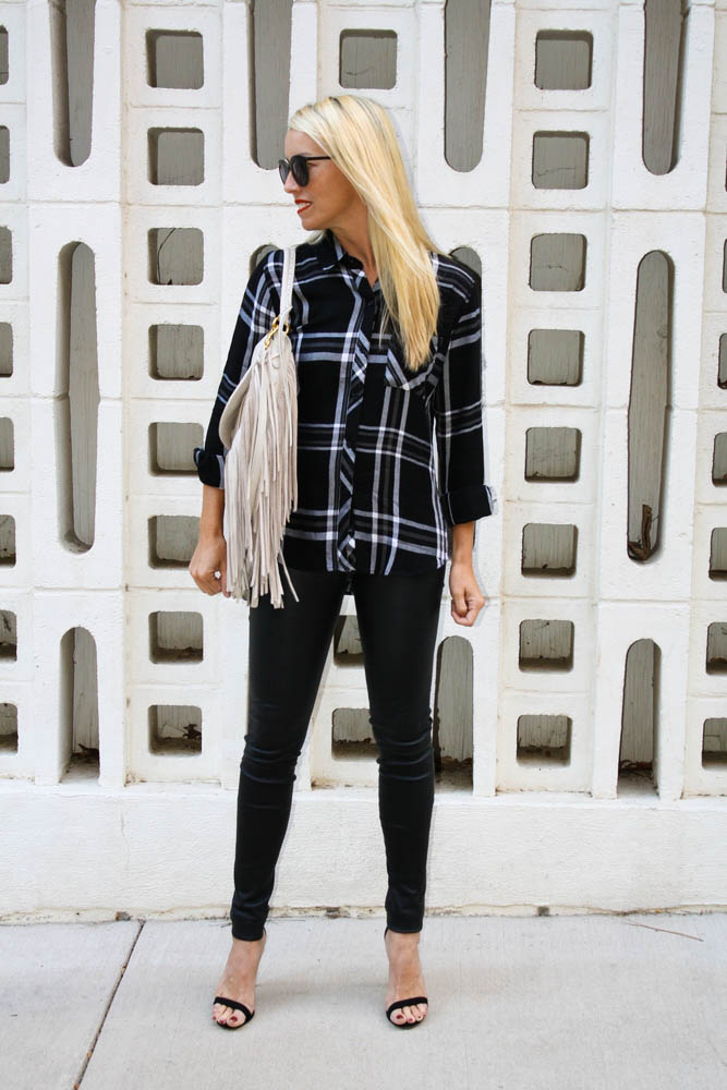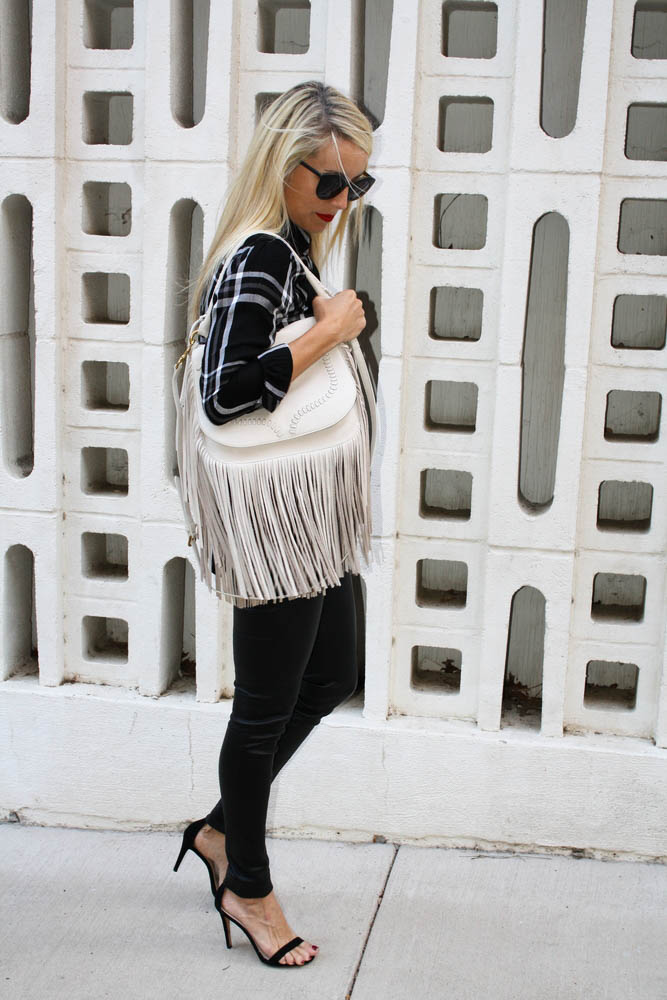 Top: Rails. Pants: Helmut Lang. Bag: Ralph Lauren (on sale). Shoes: Steve Madden (similar here).