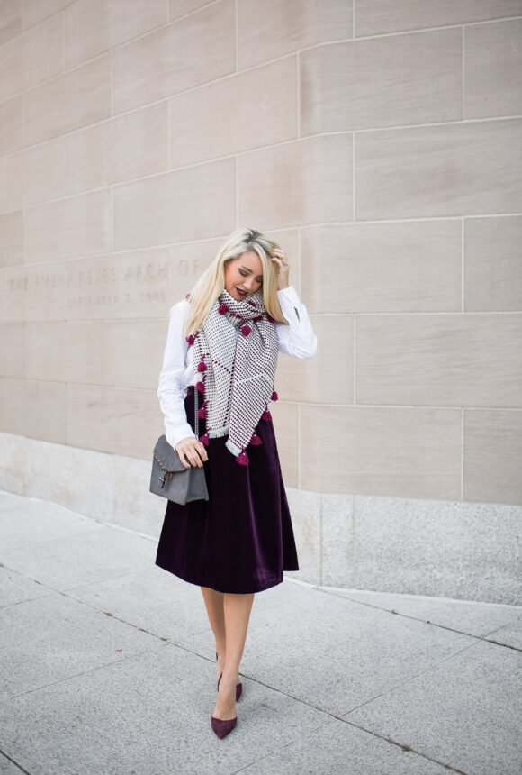 grey suede crossbody bag with chain strap, white cotton button down shirt, classic cotton button down blouse, pointed toe burgundy heels